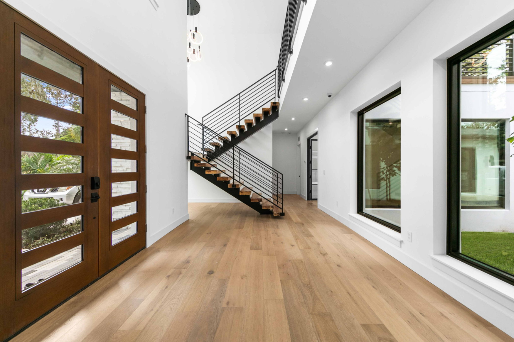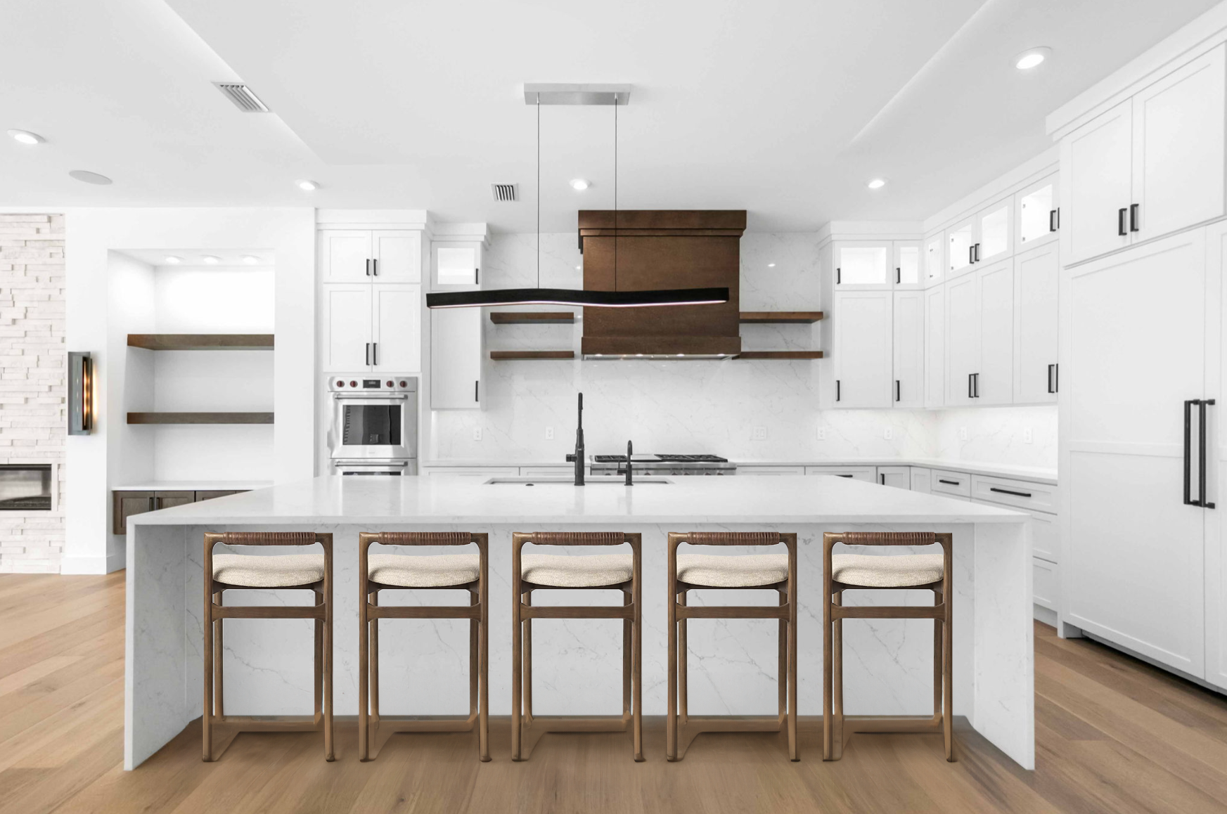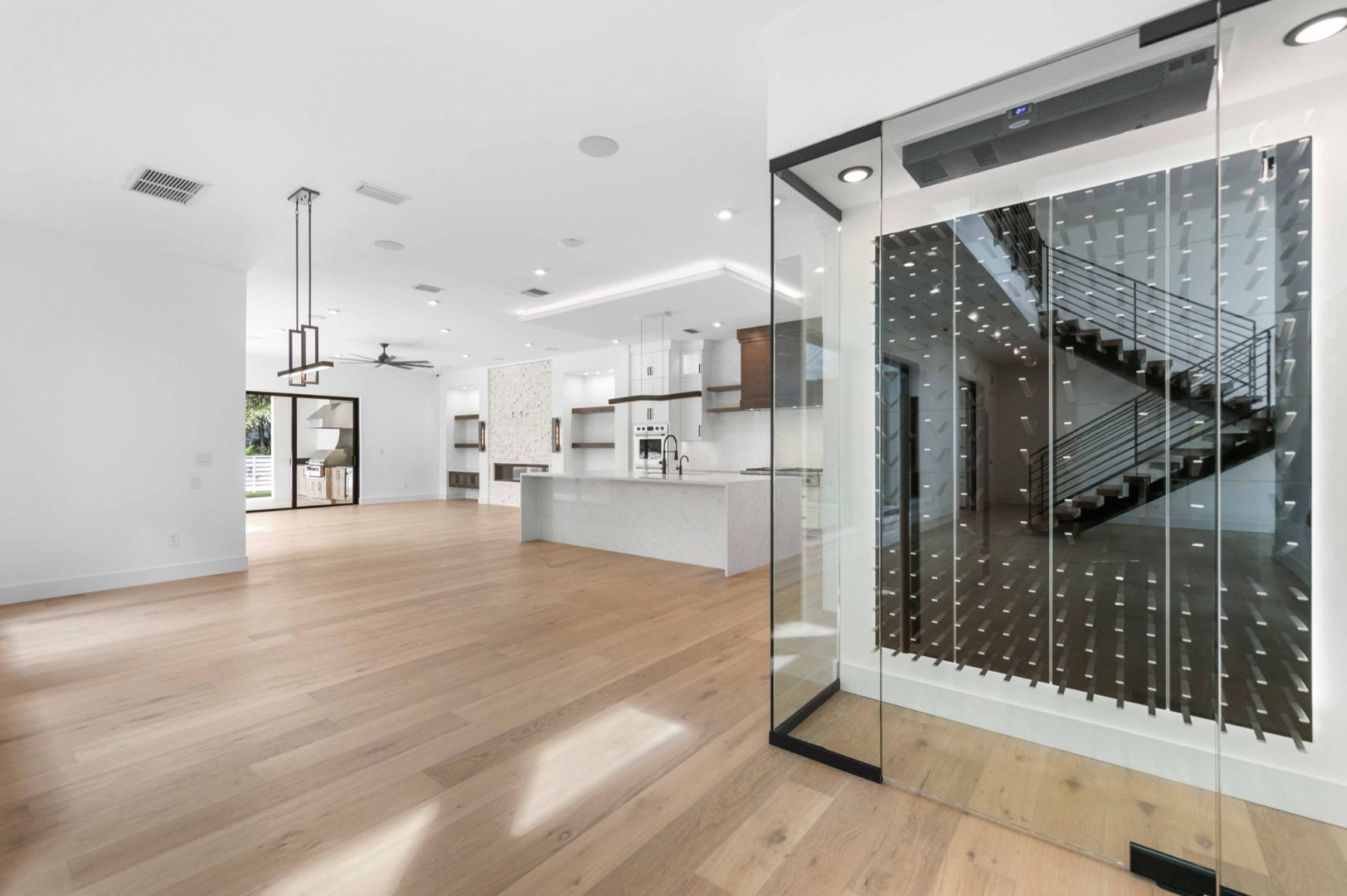 Structure meets warmth in a calm, modern interior. Natural oak and walnut woods are layered with charcoal accents, matte black iron detailing, and subtle mineral-toned grays, creating an environment that feels grounded, inviting, and refined. Textured stone surfaces, honed marble, and quartz countertops add depth and contrast, while warm wood cabinetry with linear grain patterns and minimal hardware maintains a clean, cohesive rhythm. Sculptural moments—including a floating staircase with open wood treads, a glass-enclosed wine room, and integrated lighting that traces architectural lines—bring visual interest without overpowering the home’s calm character. Open-plan living spaces encourage a seamless connection between interior and exterior, resulting in a light-filled residence designed for modern living with a relaxed, welcoming sensibility.