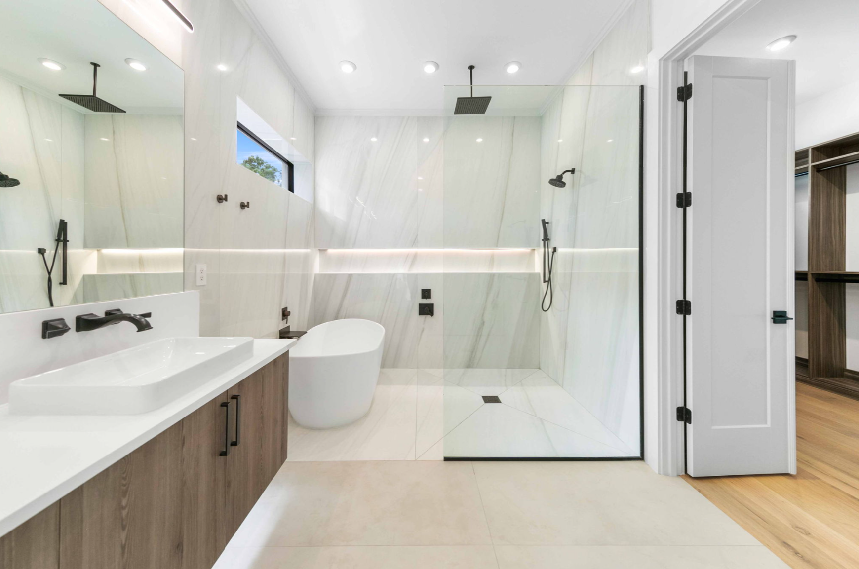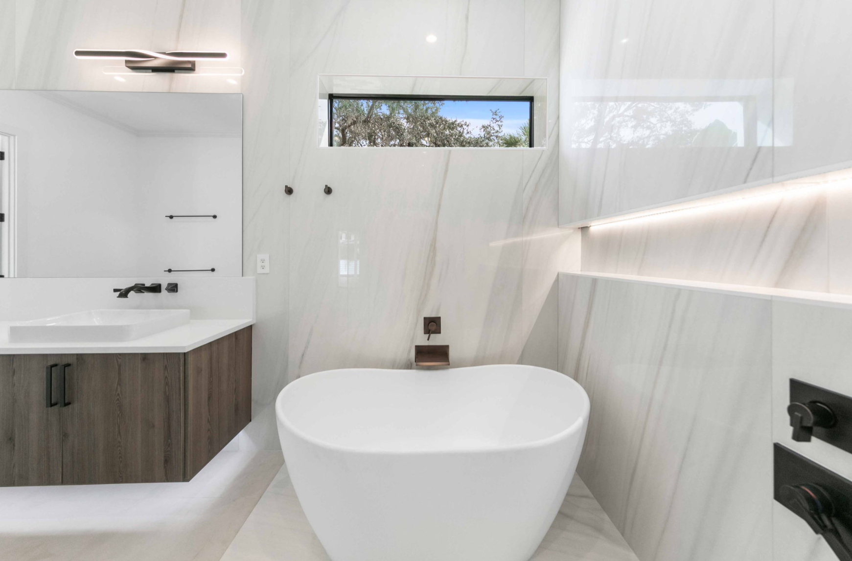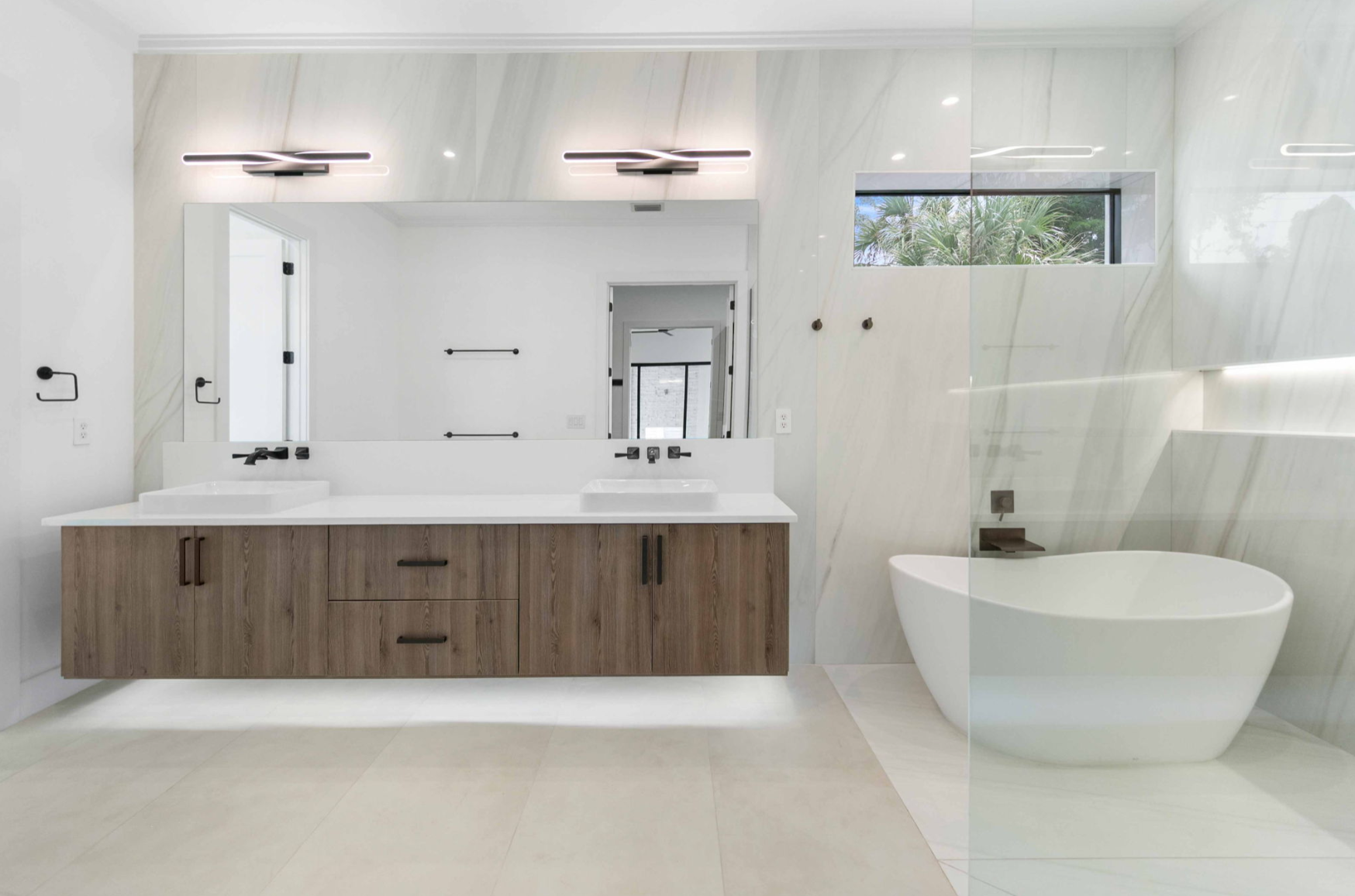 Structure meets warmth in a calm, modern interior. Natural oak and walnut woods are layered with charcoal accents, matte black iron detailing, and subtle mineral-toned grays, creating an environment that feels grounded, inviting, and refined. Textured stone surfaces, honed marble, and quartz countertops add depth and contrast, while warm wood cabinetry with linear grain patterns and minimal hardware maintains a clean, cohesive rhythm. Sculptural moments—including a floating staircase with open wood treads, a glass-enclosed wine room, and integrated lighting that traces architectural lines—bring visual interest without overpowering the home’s calm character. Open-plan living spaces encourage a seamless connection between interior and exterior, resulting in a light-filled residence designed for modern living with a relaxed, welcoming sensibility.