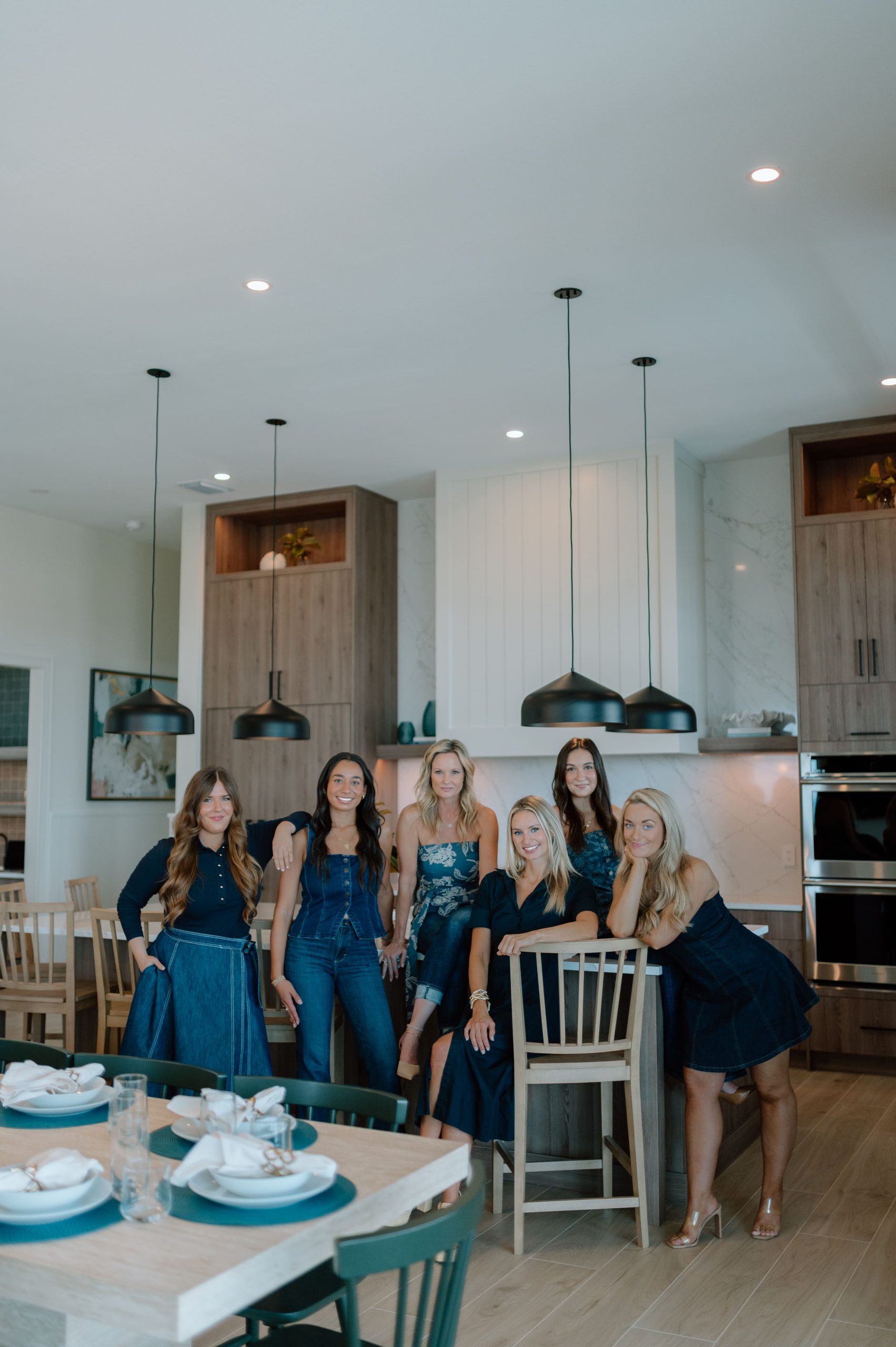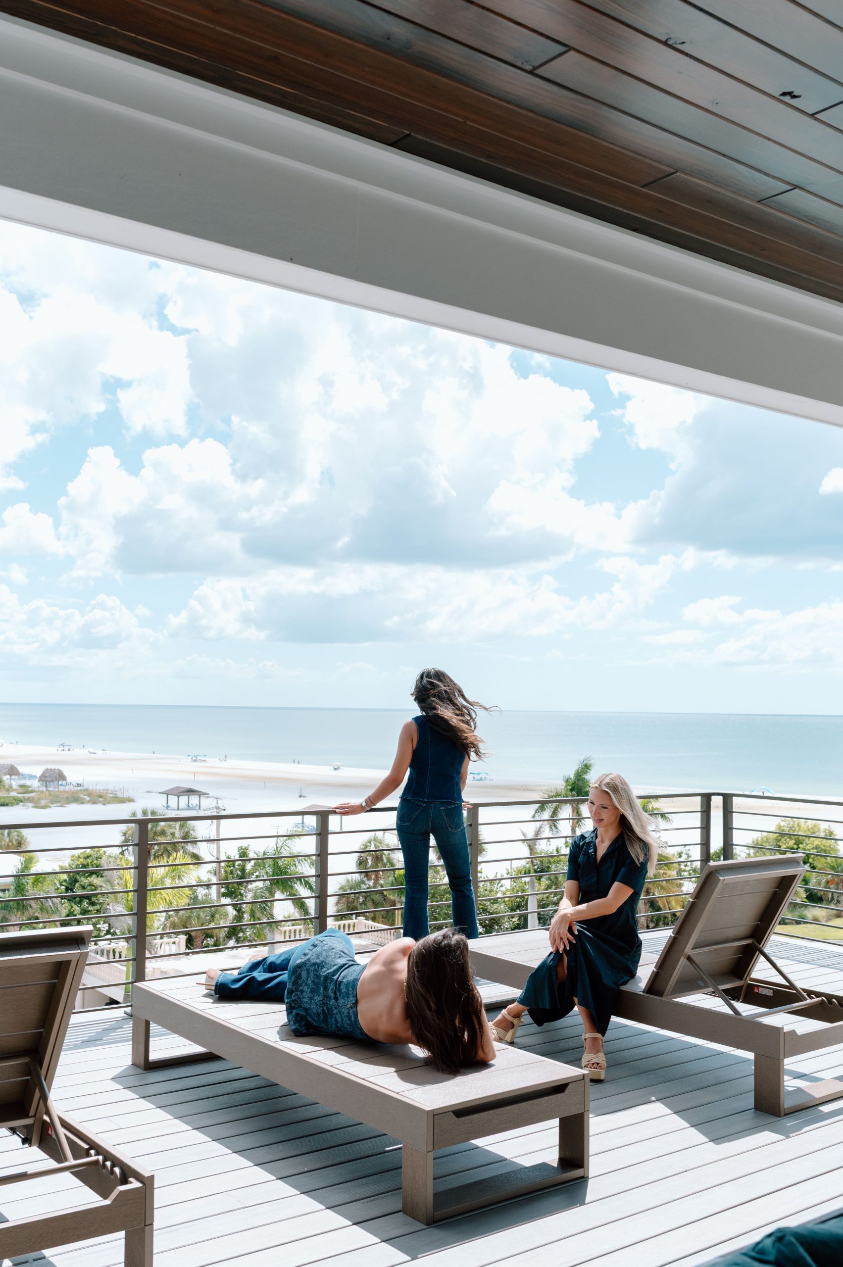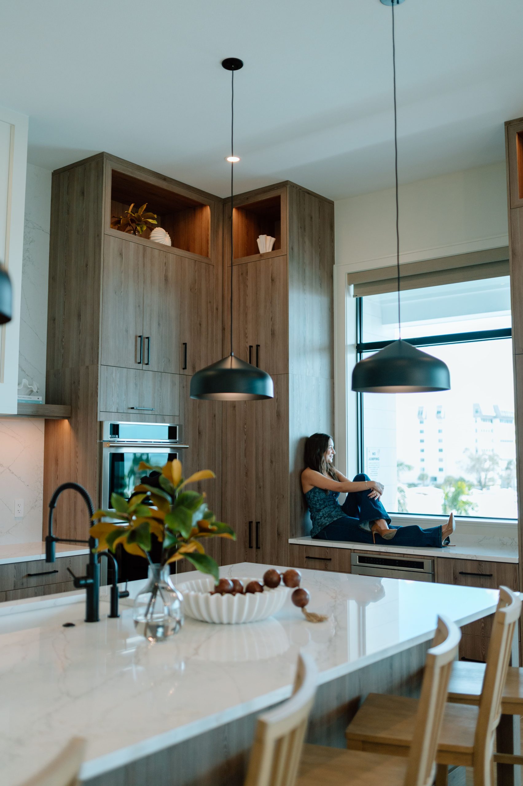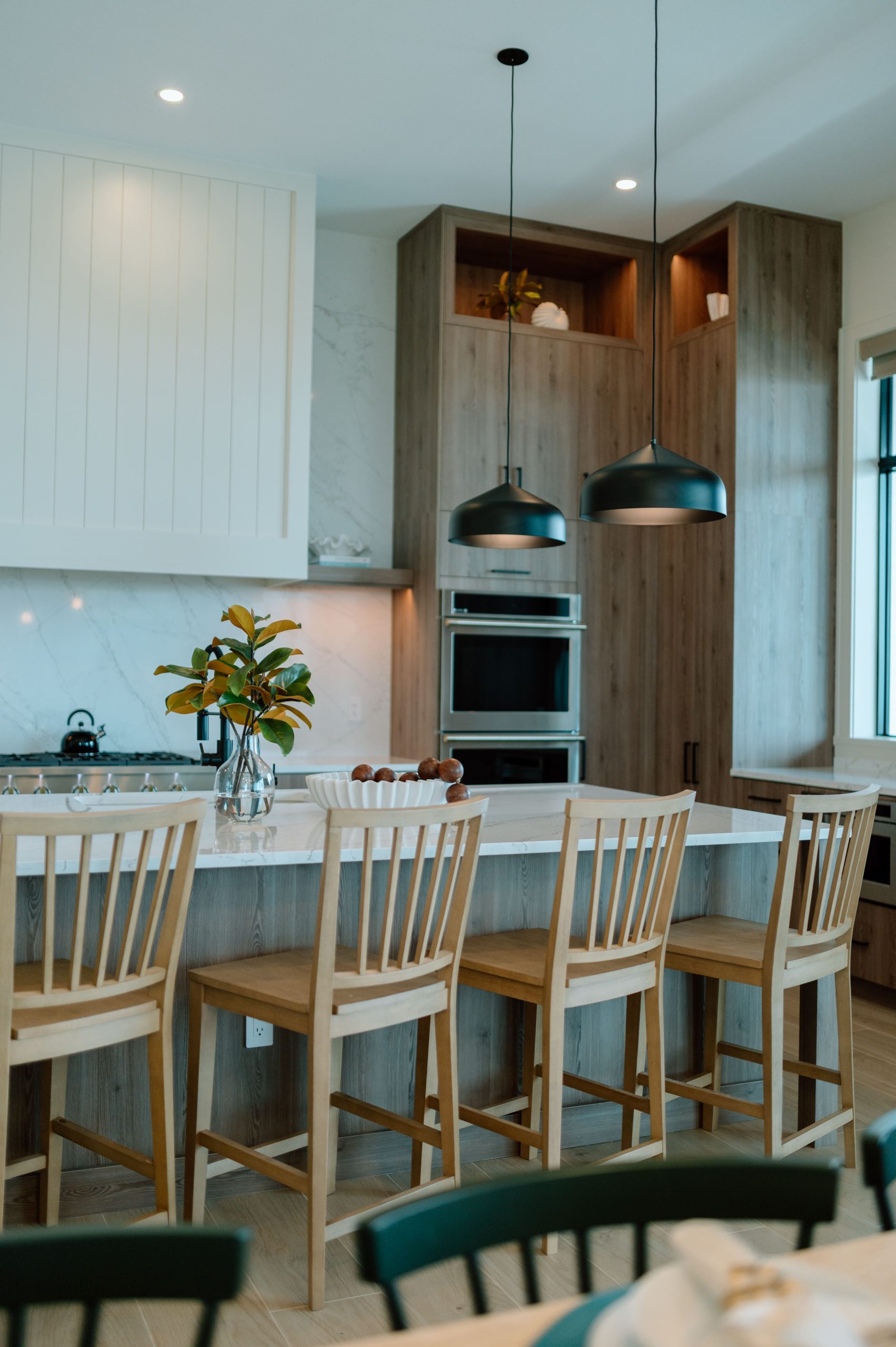 Layered texture and thoughtful detail shape the interior experience at Over The Top. A warm, neutral palette is accented with subtle hints of teal, echoing the surrounding shoreline and expansive beach views framed by black steel windows. Streamlined cabinetry and walnut-stained millwork introduce a clean architectural backbone, while exposed beam detailing adds rhythm and warmth overhead. Integrated lighting and moments of pattern play bring depth and visual interest throughout, softening the modern lines with an organic sensibility. The result is a composed coastal retreat where structure and texture work together to create a refined yet relaxed atmosphere.