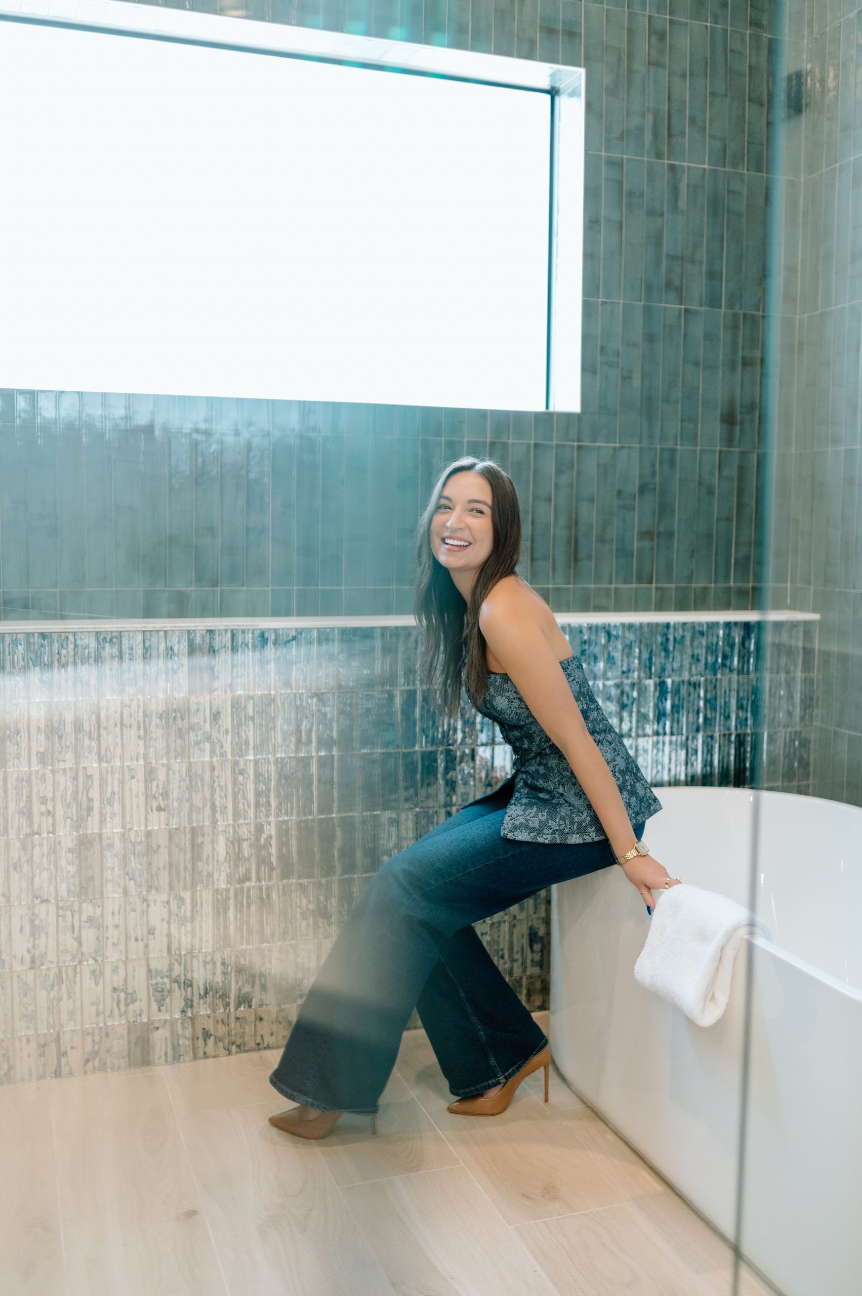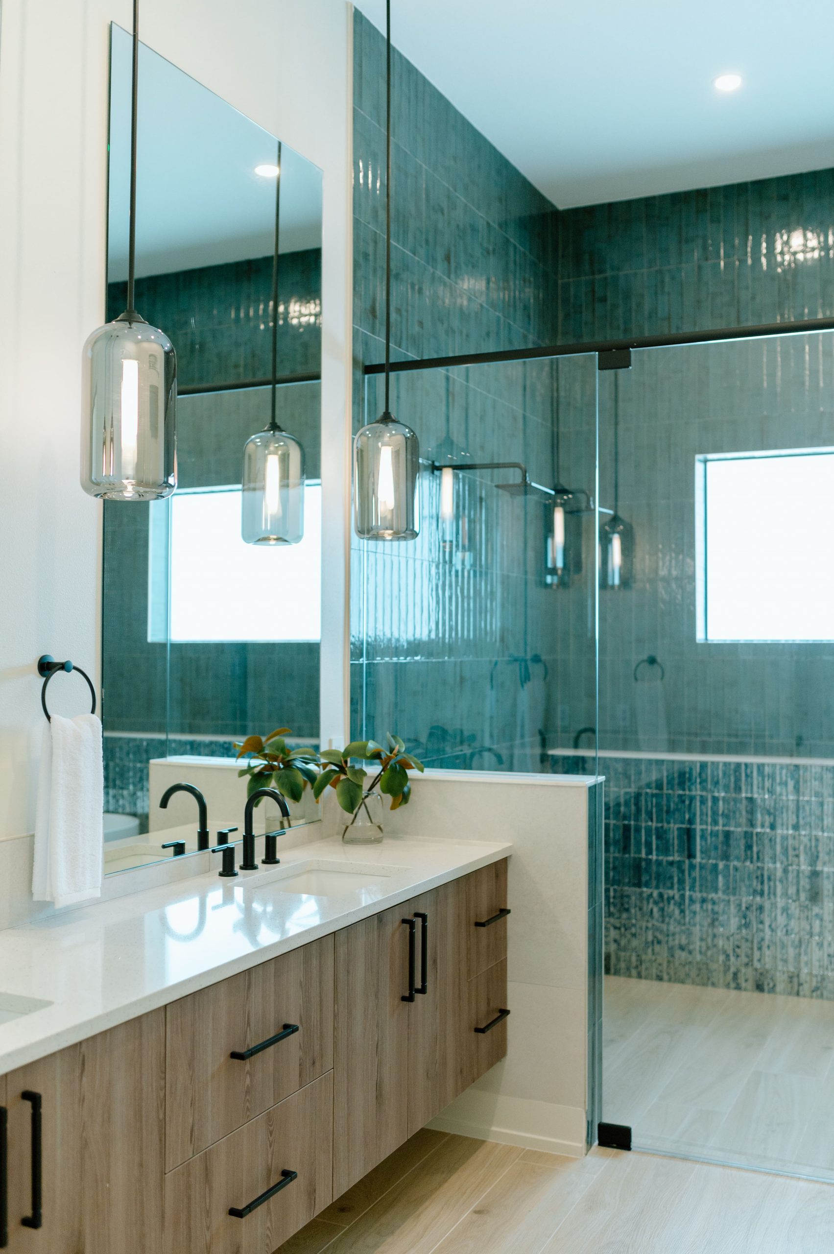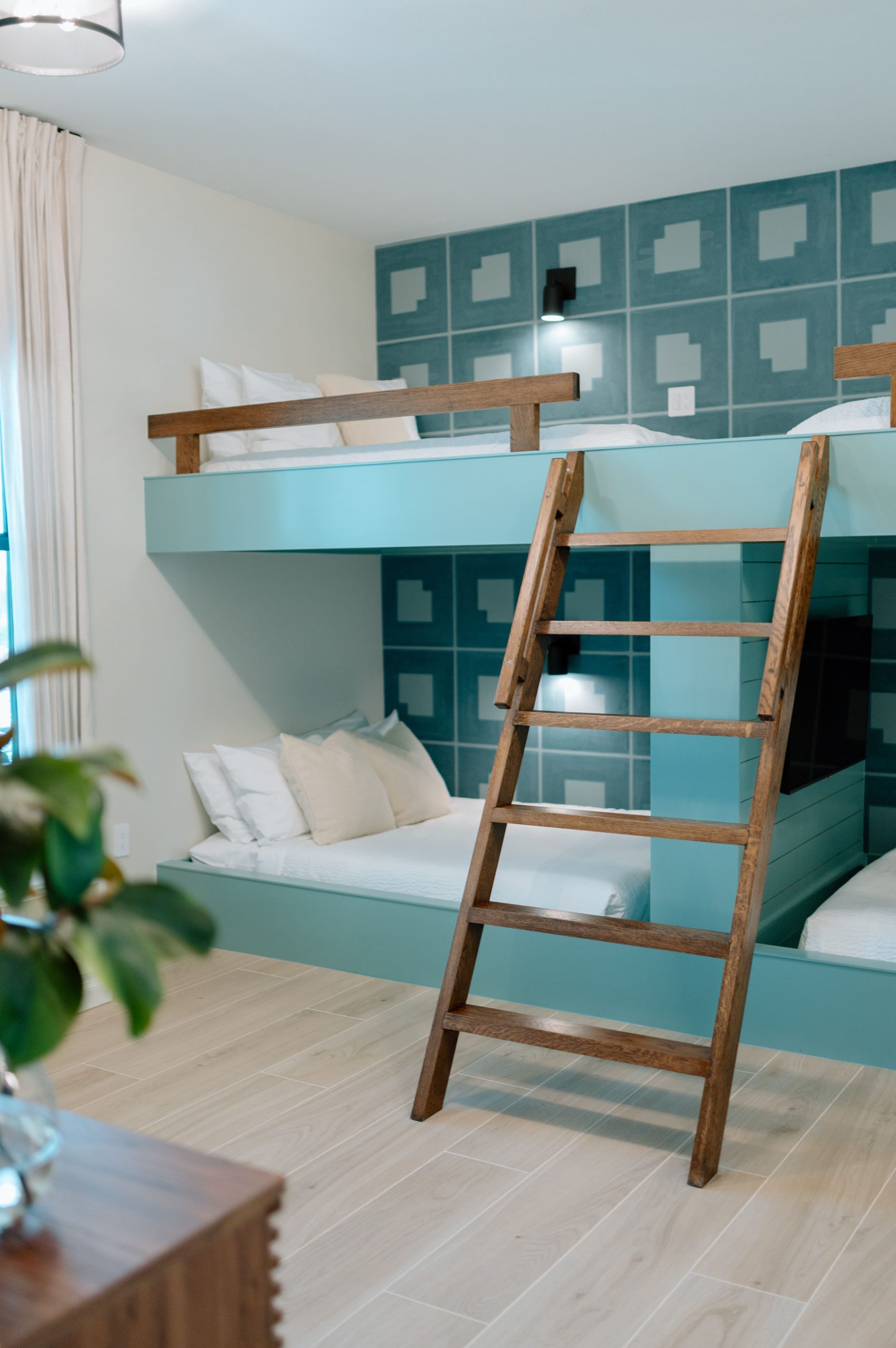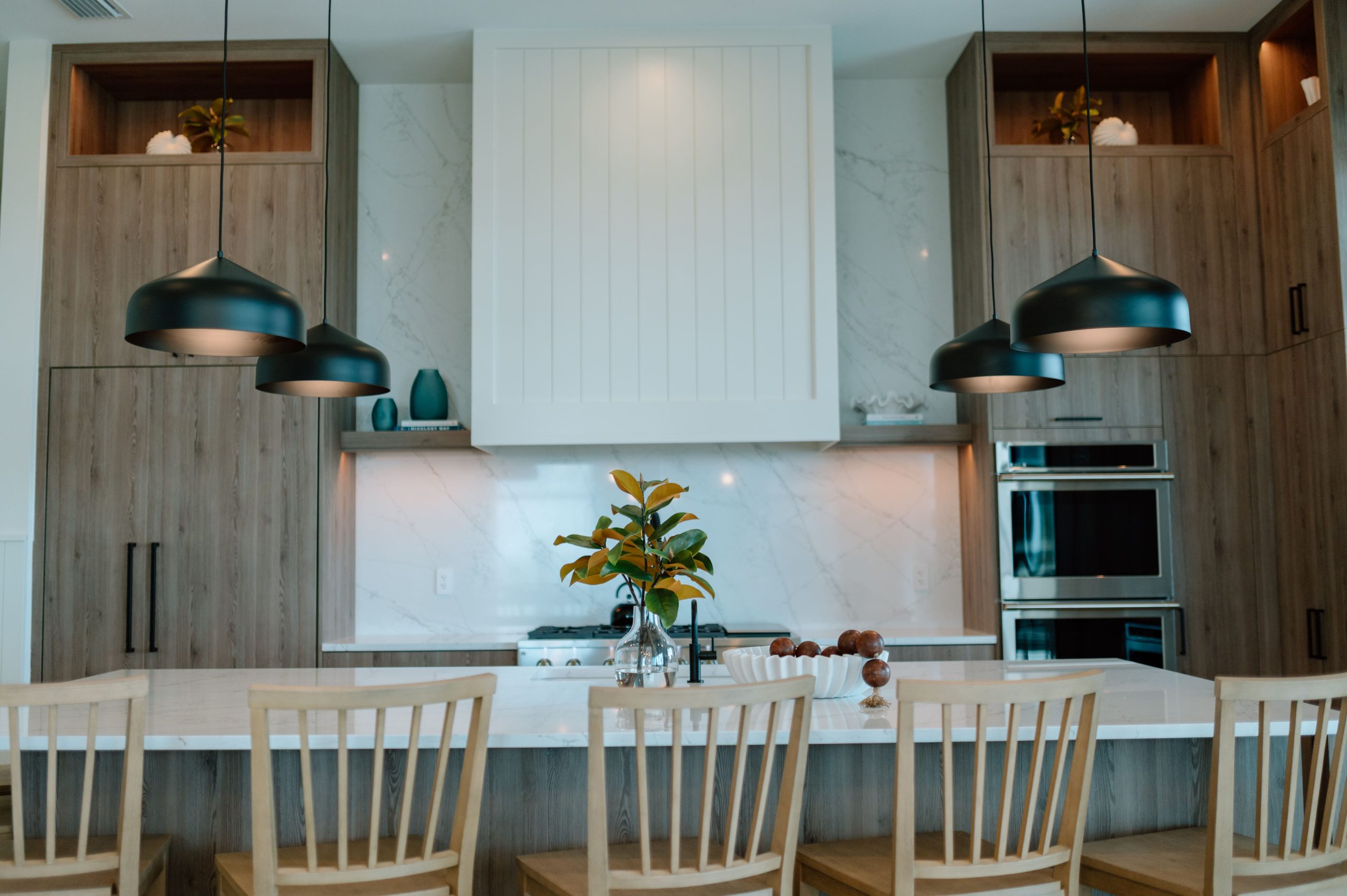 Layered texture and thoughtful detail shape the interior experience at Over The Top. A warm, neutral palette is accented with subtle hints of teal, echoing the surrounding shoreline and expansive beach views framed by black steel windows. Streamlined cabinetry and walnut-stained millwork introduce a clean architectural backbone, while exposed beam detailing adds rhythm and warmth overhead. Integrated lighting and moments of pattern play bring depth and visual interest throughout, softening the modern lines with an organic sensibility. The result is a composed coastal retreat where structure and texture work together to create a refined yet relaxed atmosphere.