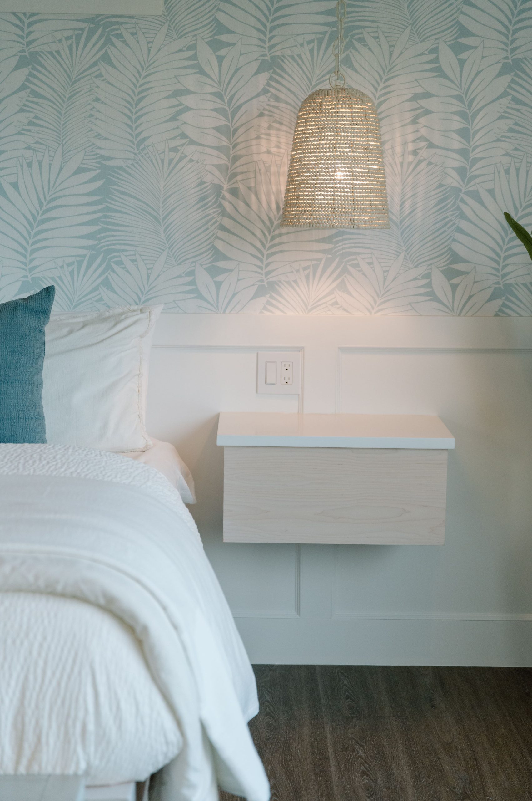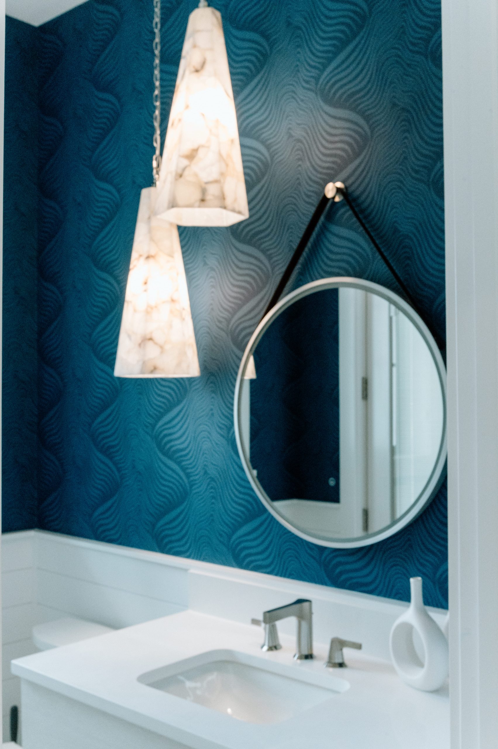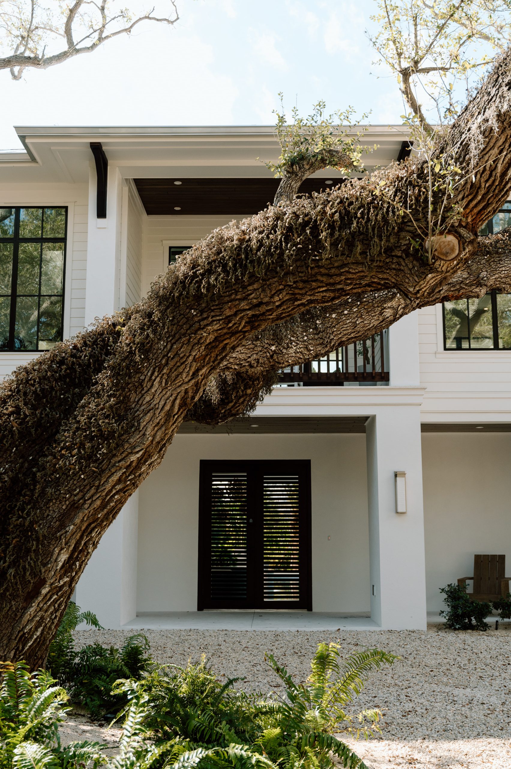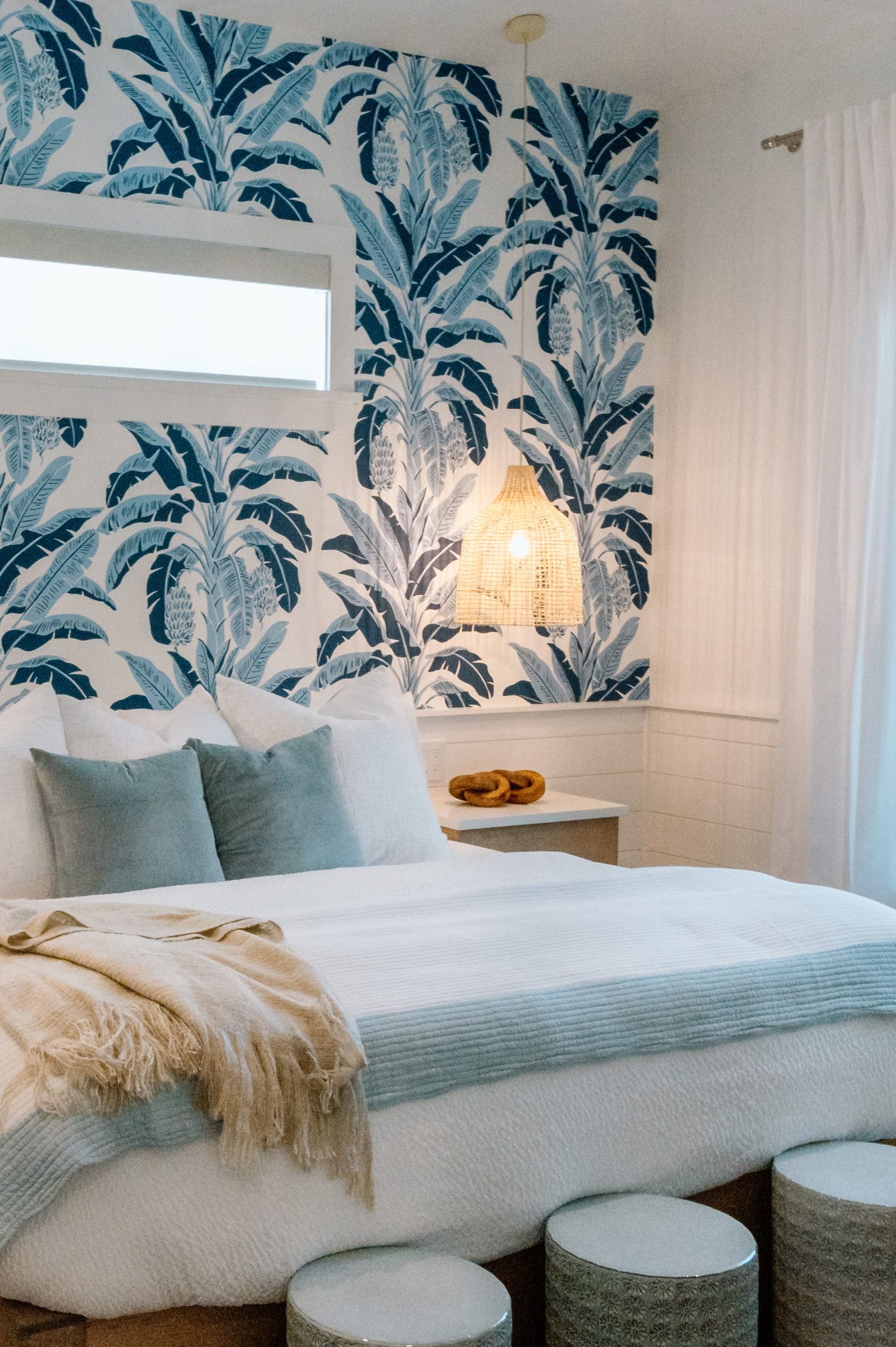 Materiality and light define the interior experience at Salty Oak. Nestled beneath century-old oak trees, the interiors unfold in layers of whites, sand, and driftwood tones, punctuated by deep ocean blues and indigo accents. Stacked stone feature walls introduce mass and texture, while smooth plaster, natural oak, and white shiplap establish a cohesive architectural language throughout. Woven lighting, rattan pendants, and linen textiles soften the interiors, as patterned wallcoverings reference the surrounding landscape. Carefully considered lighting transitions—from bright morning light to a warm evening glow—enhance depth and atmosphere, resulting in a calm, refined retreat rooted in its coastal context.