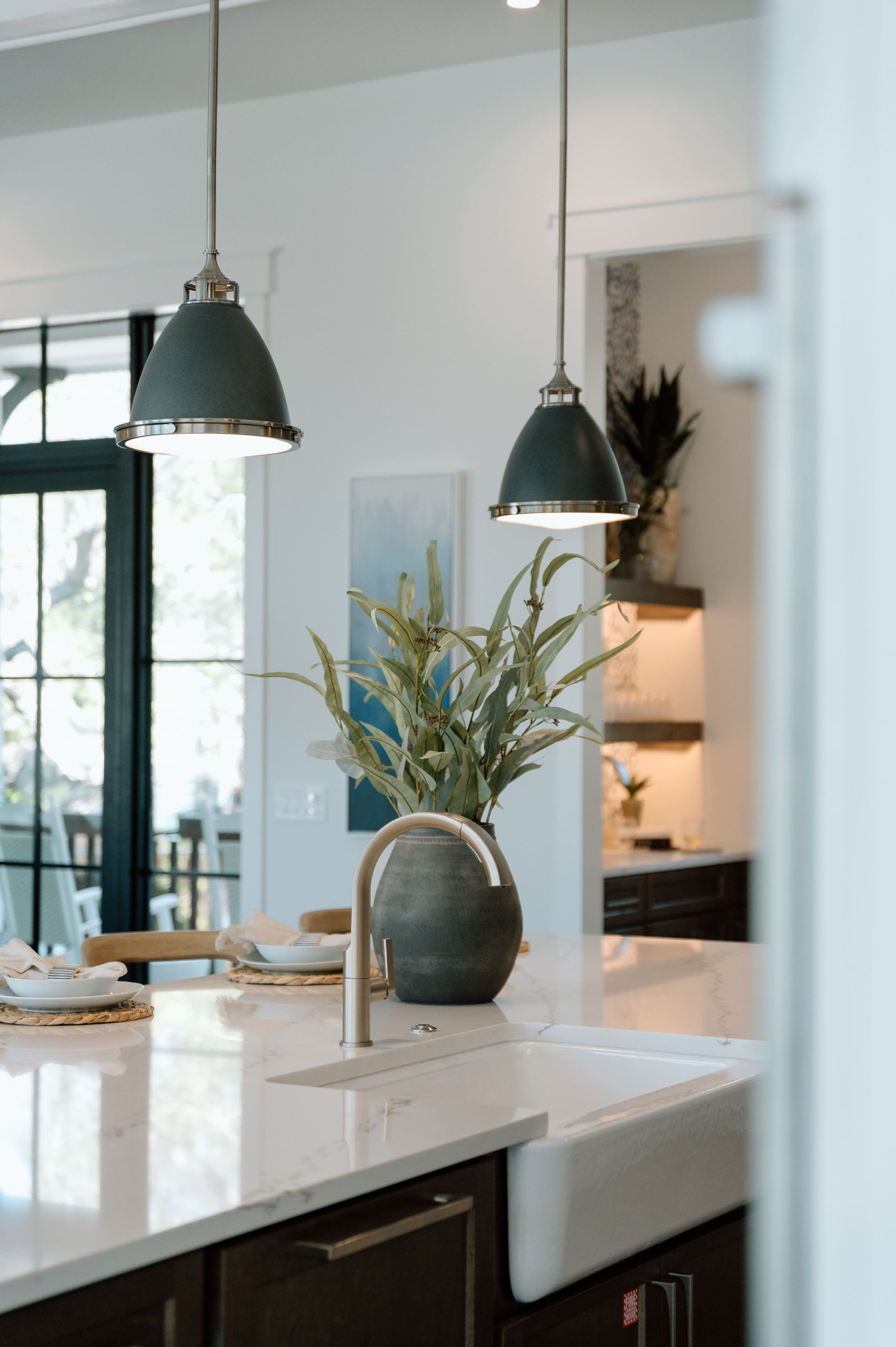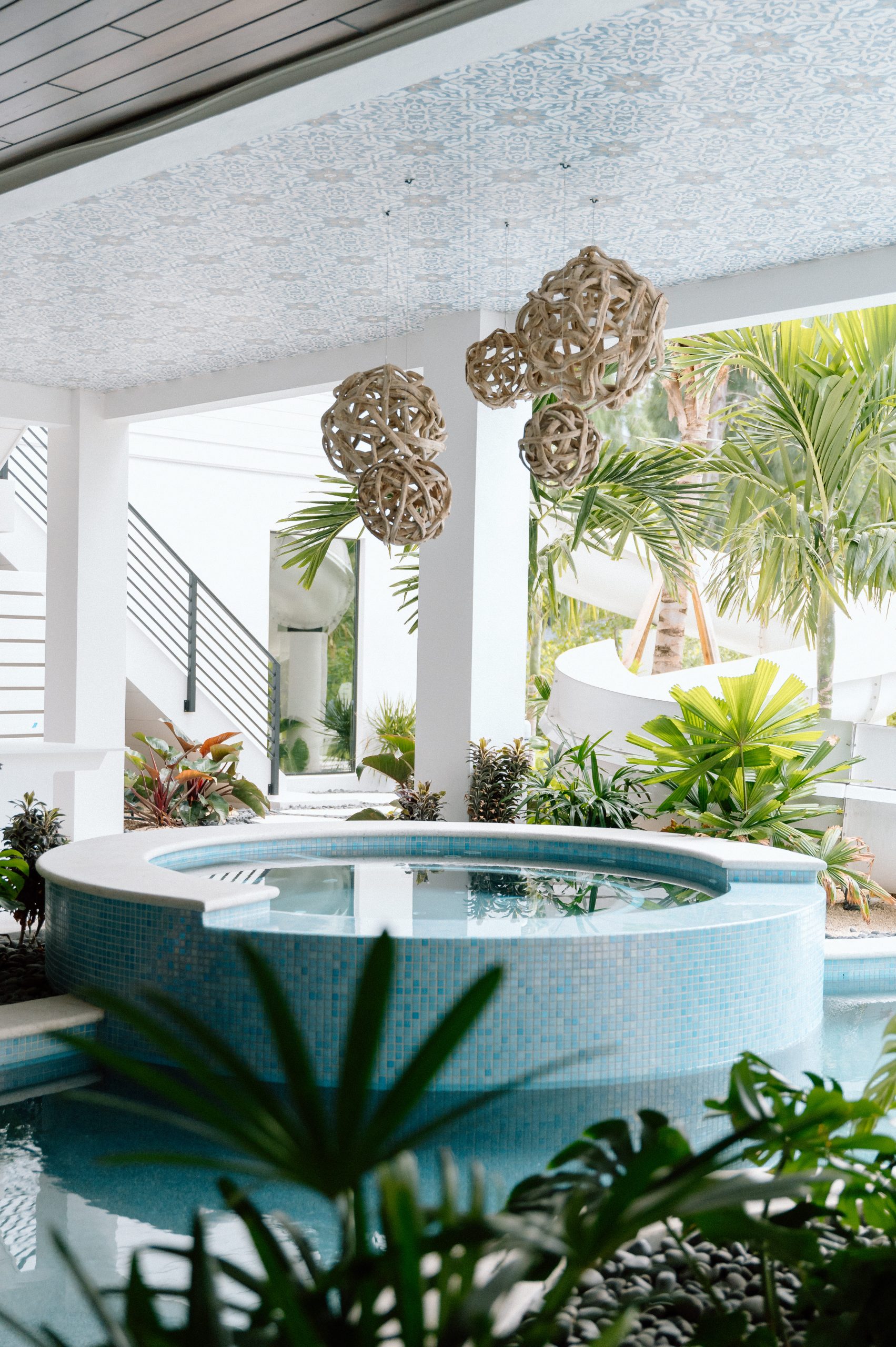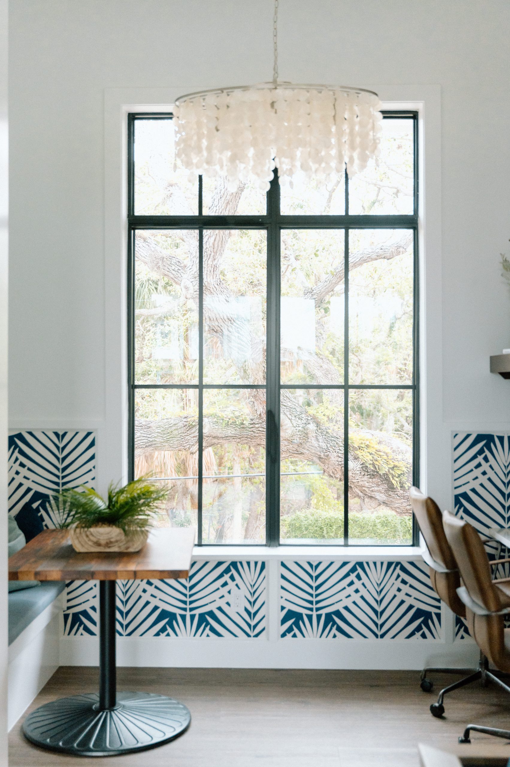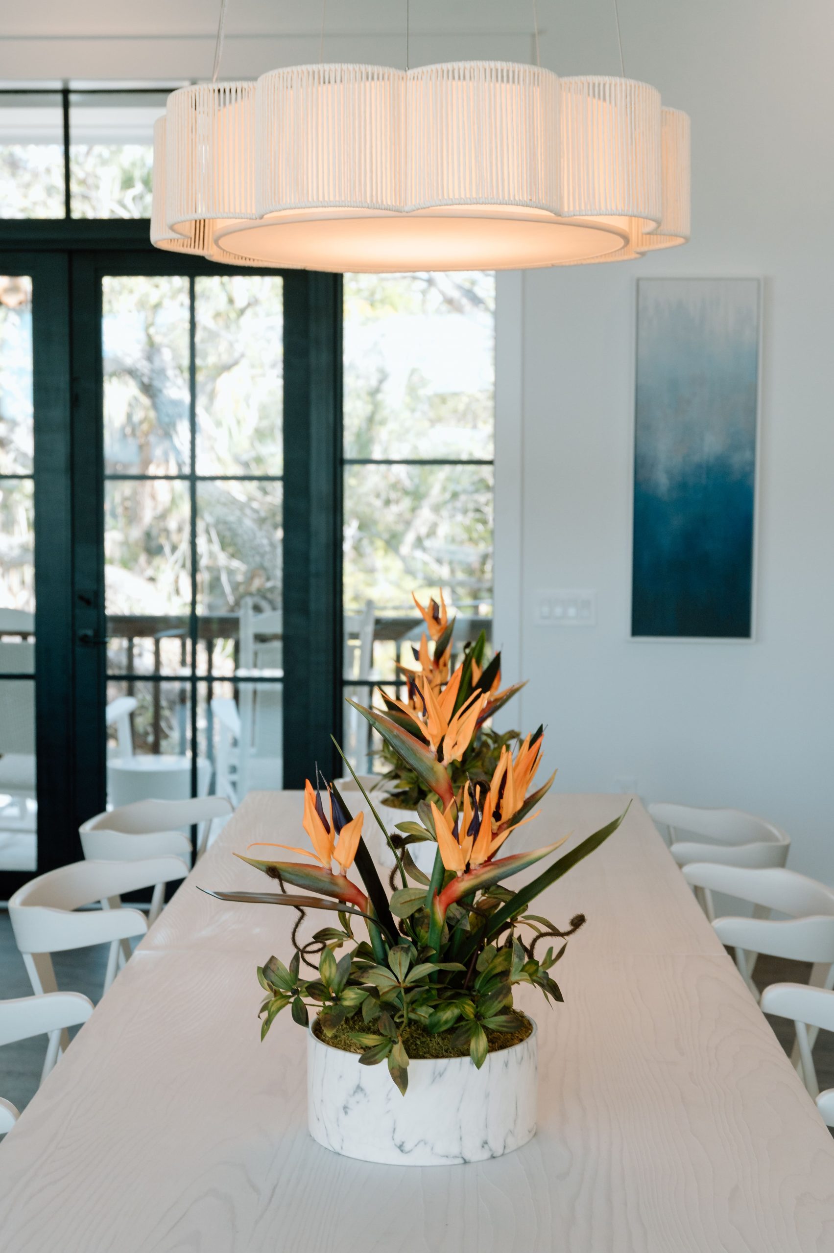 Materiality and light define the interior experience at Salty Oak. Nestled beneath century-old oak trees, the interiors unfold in layers of whites, sand, and driftwood tones, punctuated by deep ocean blues and indigo accents. Stacked stone feature walls introduce mass and texture, while smooth plaster, natural oak, and white shiplap establish a cohesive architectural language throughout. Woven lighting, rattan pendants, and linen textiles soften the interiors, as patterned wallcoverings reference the surrounding landscape. Carefully considered lighting transitions—from bright morning light to a warm evening glow—enhance depth and atmosphere, resulting in a calm, refined retreat rooted in its coastal context.