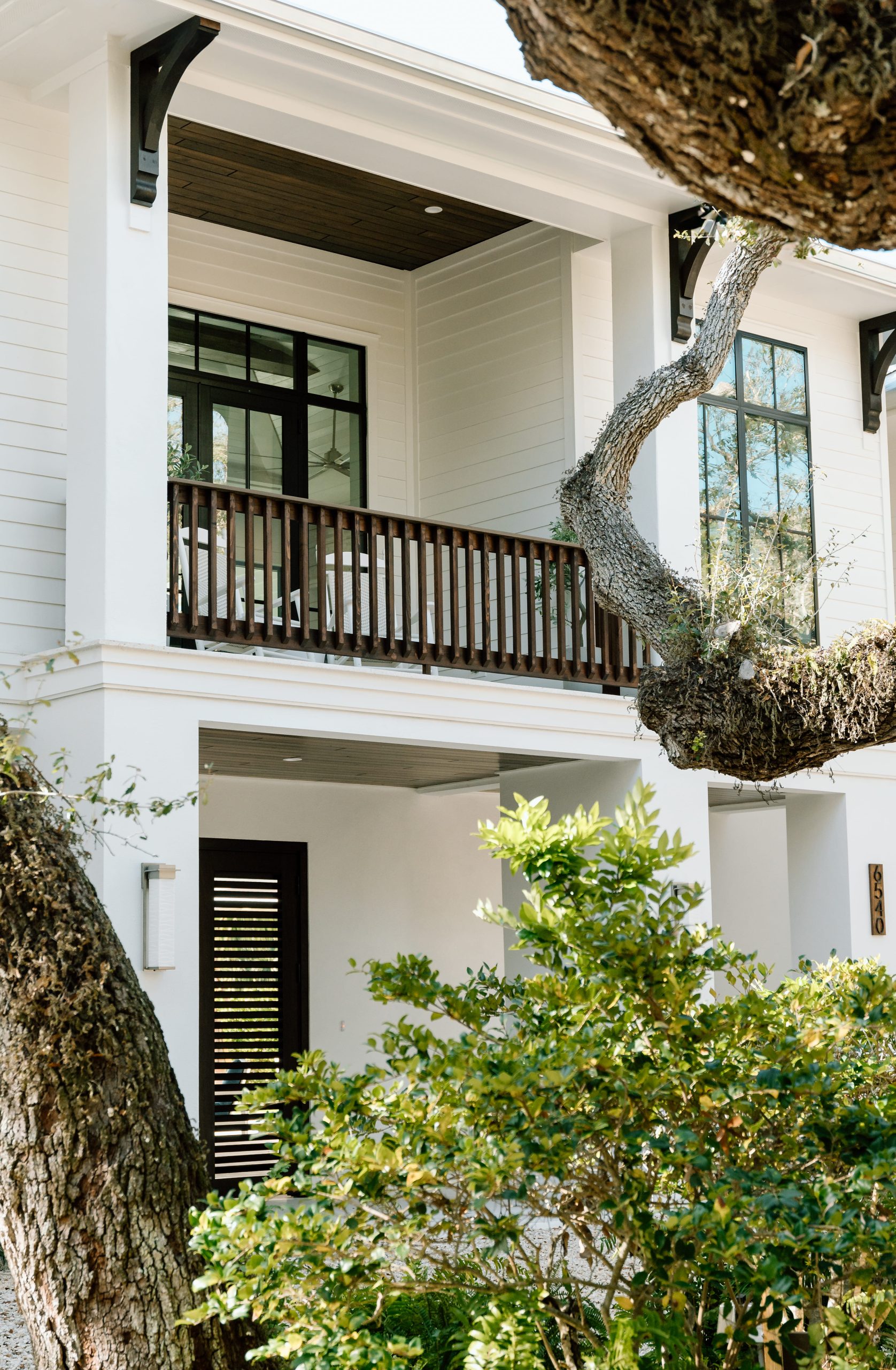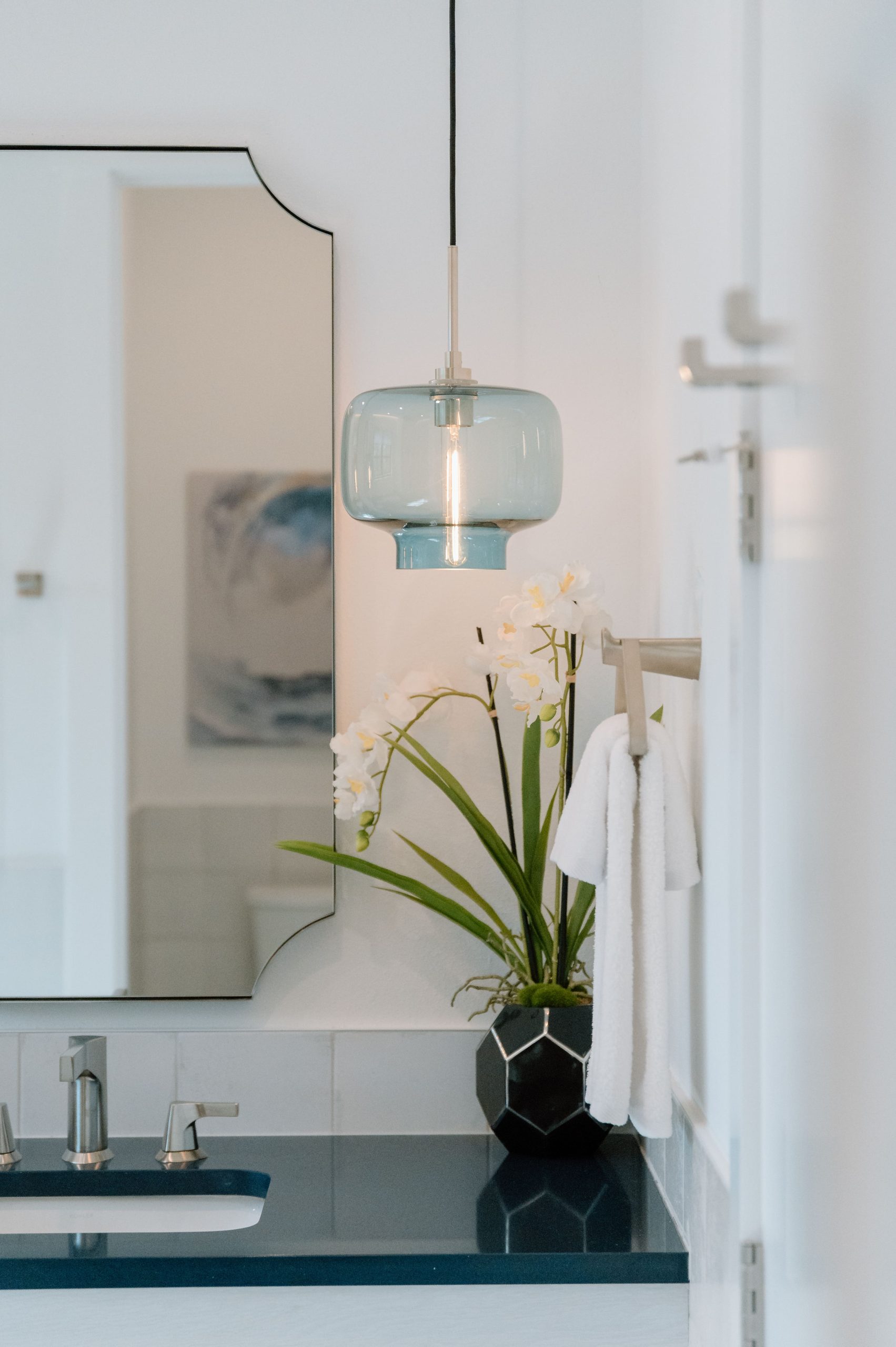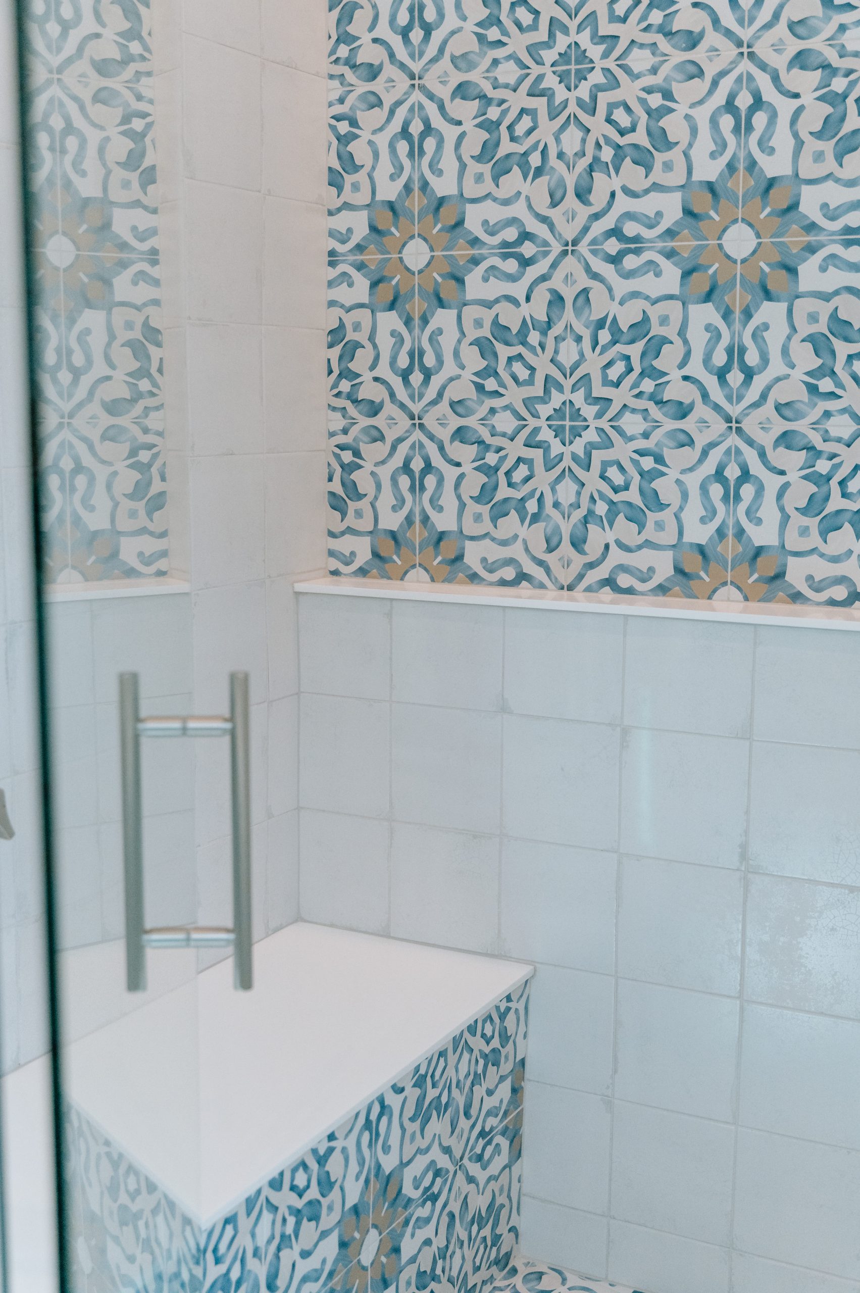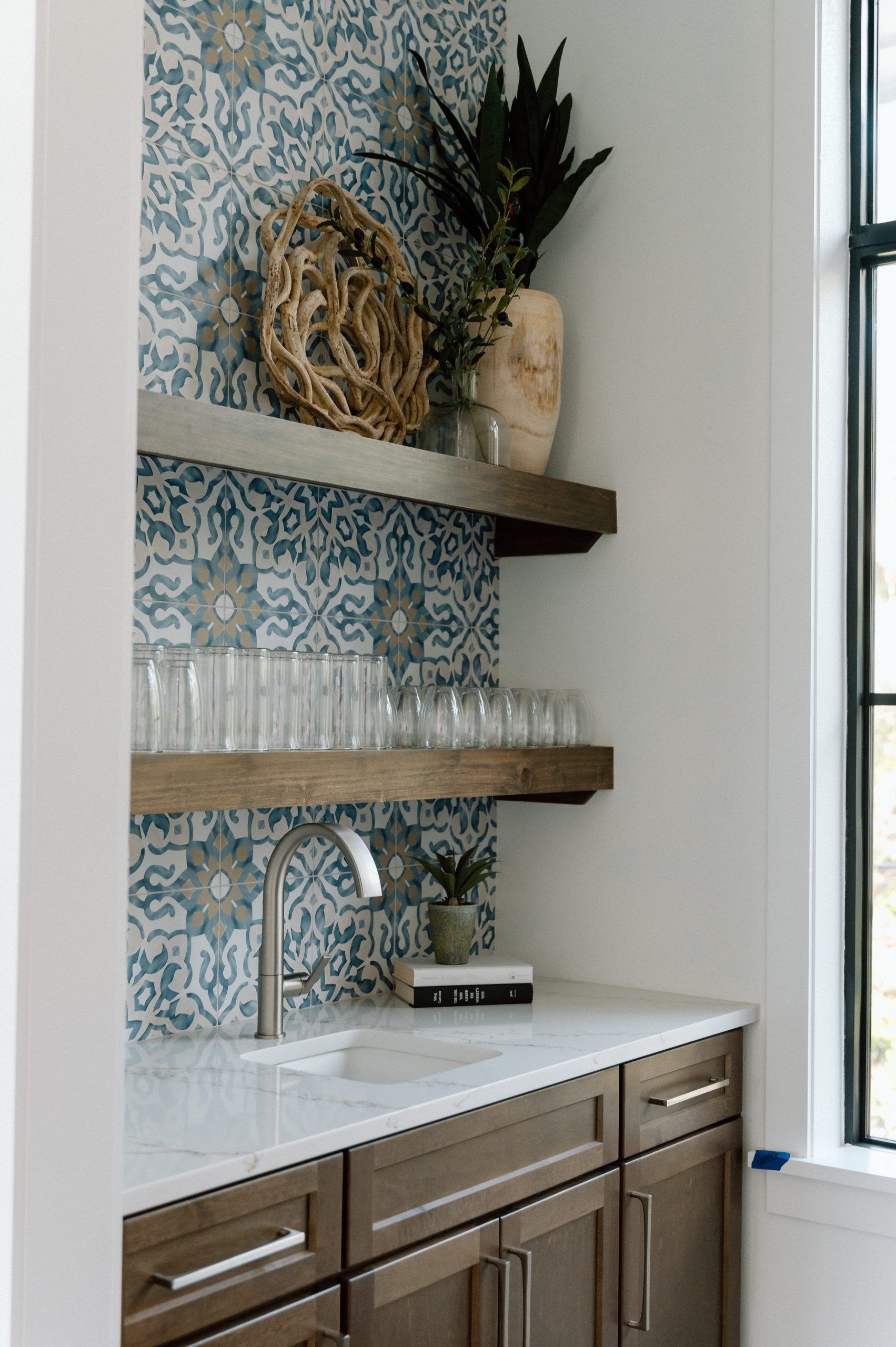Materiality and light define the interior experience at Salty Oak. Nestled beneath century-old oak trees, the interiors unfold in layers of whites, sand, and driftwood tones, punctuated by deep ocean blues and indigo accents. Stacked stone feature walls introduce mass and texture, while smooth plaster, natural oak, and white shiplap establish a cohesive architectural language throughout. Woven lighting, rattan pendants, and linen textiles soften the interiors, as patterned wallcoverings reference the surrounding landscape. Carefully considered lighting transitions—from bright morning light to a warm evening glow—enhance depth and atmosphere, resulting in a calm, refined retreat rooted in its coastal context.