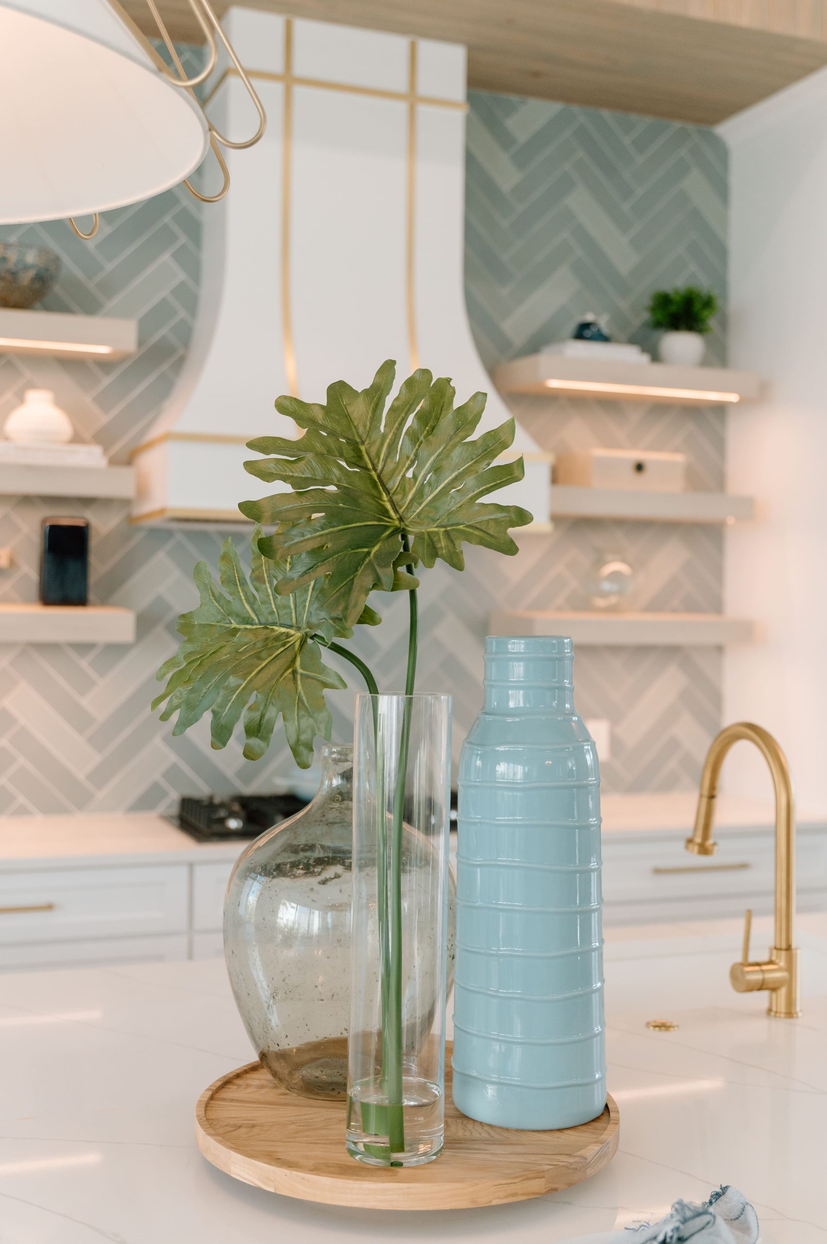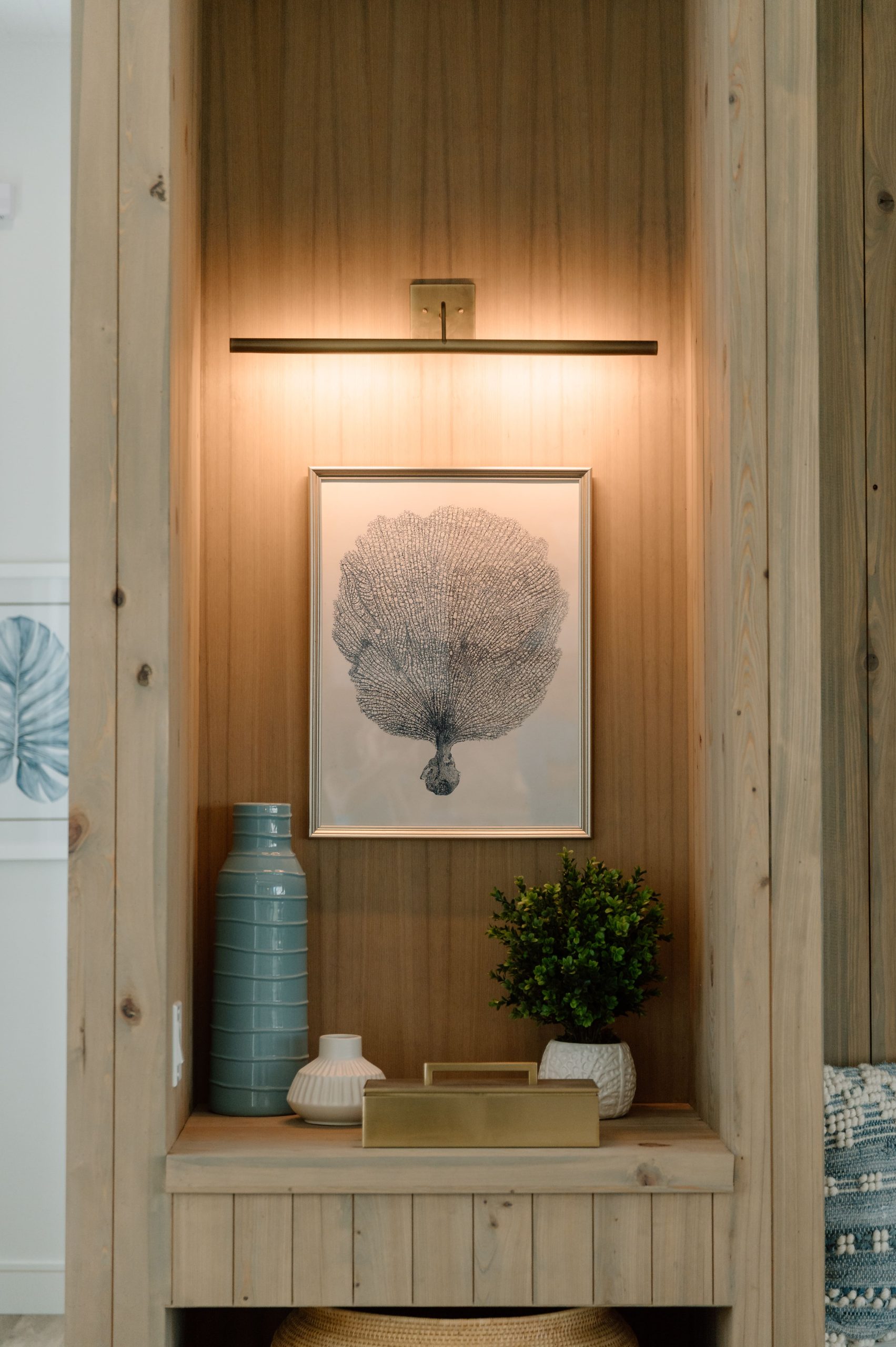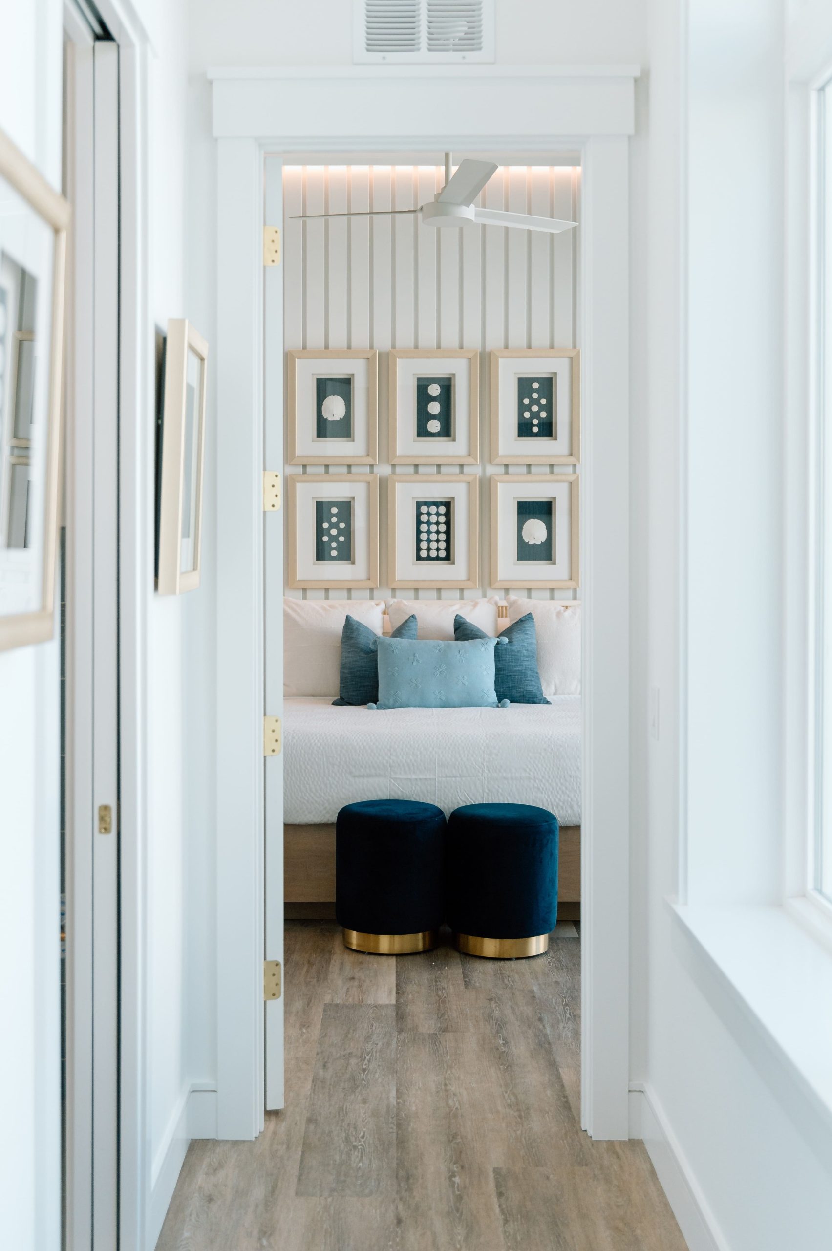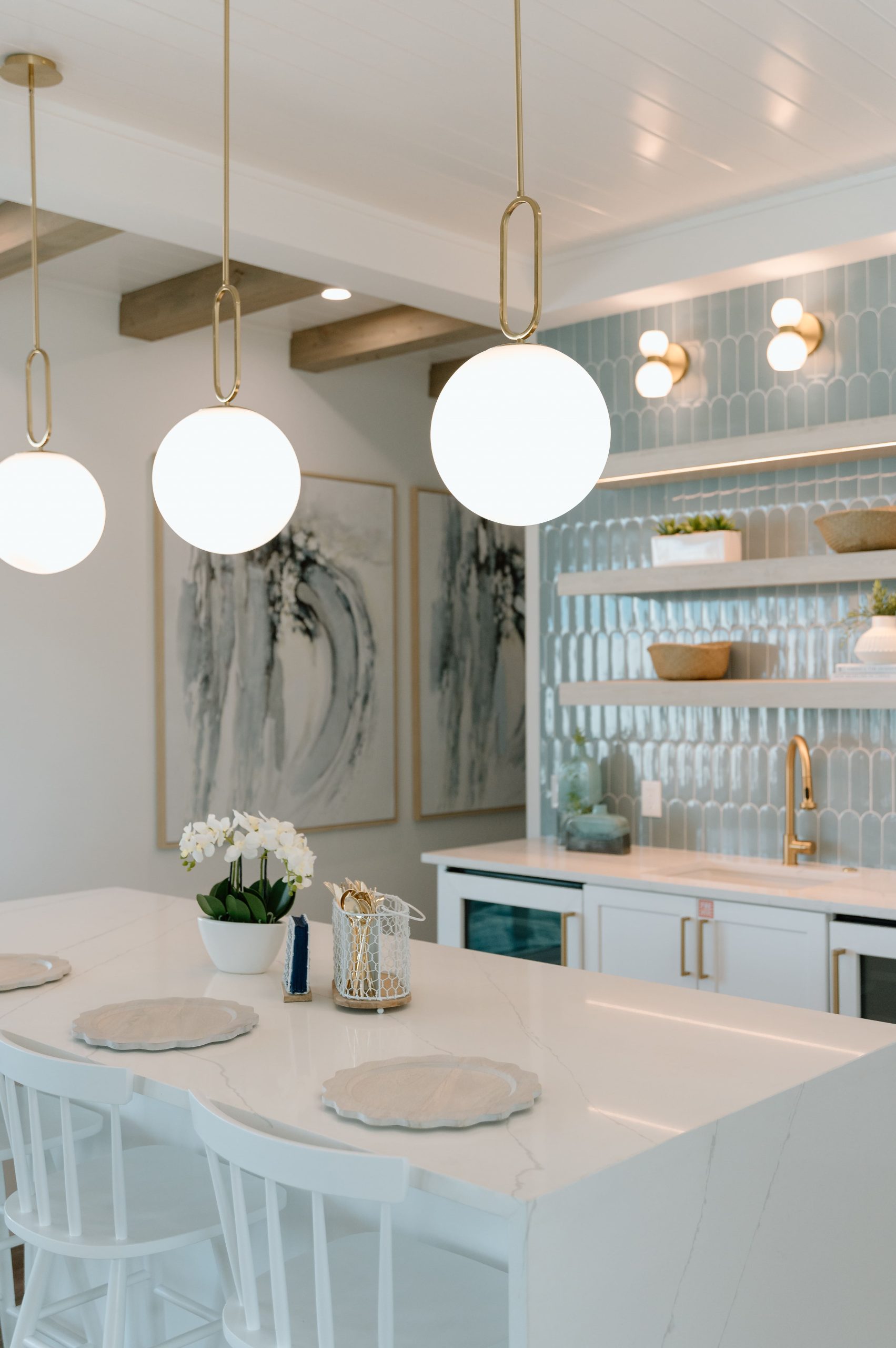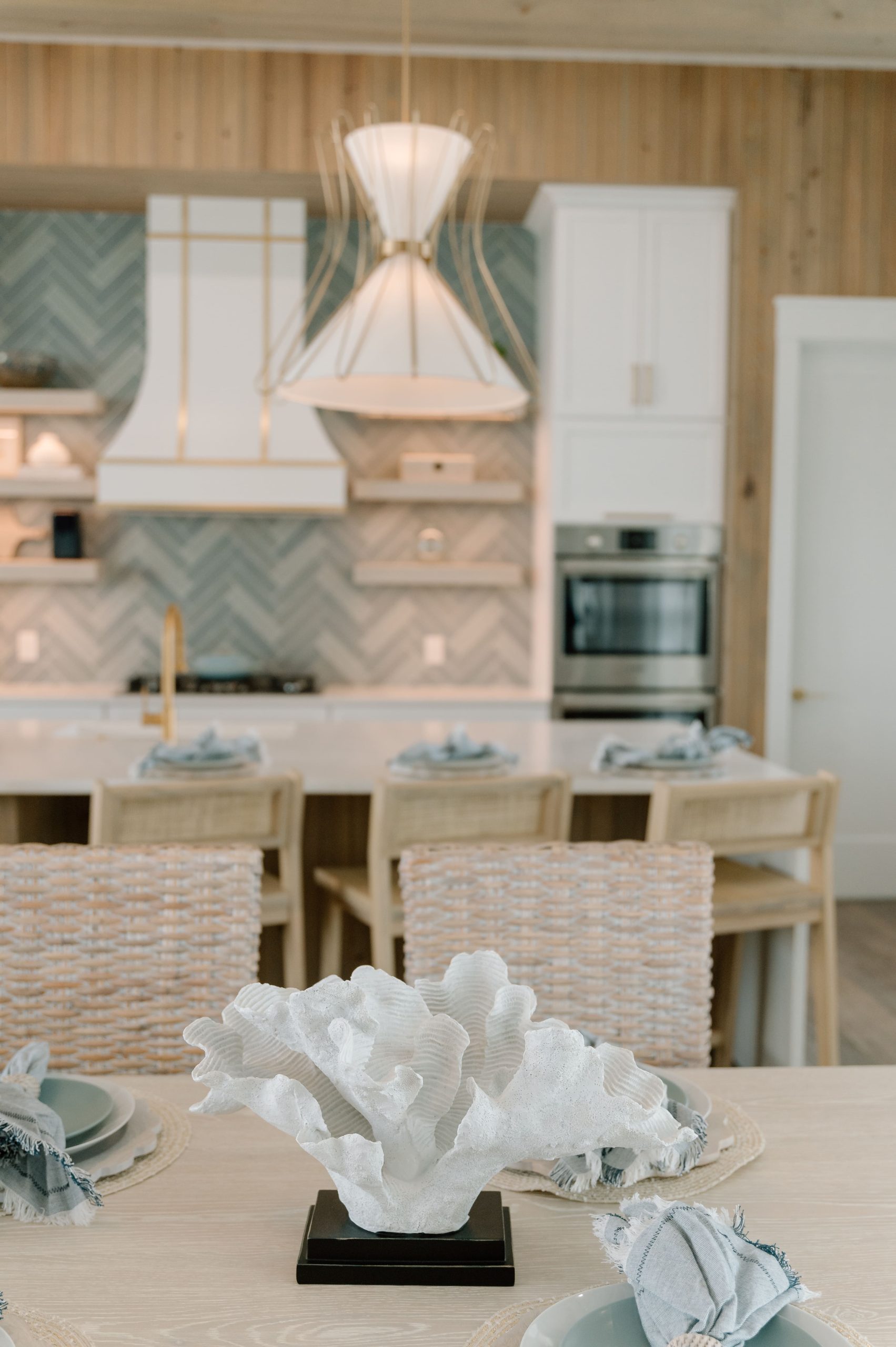 Designed for gathering and easy elegance, Sandbar Social offers a polished interpretation of coastal transitional living. A light, airy palette of crisp white and soft ivory is layered with misty gray-blues, seafoam greens, and hints of sandy beige and driftwood tones, creating a relaxed yet refined backdrop. Accents of navy and deep indigo add depth and definition, while warm brass and gold finishes introduce subtle warmth. Balanced symmetry, thoughtful detailing, and ocean-inspired motifs lend a sense of rhythm throughout, resulting in a breezy seaside retreat designed for connection, conversation, and effortless coastal living.