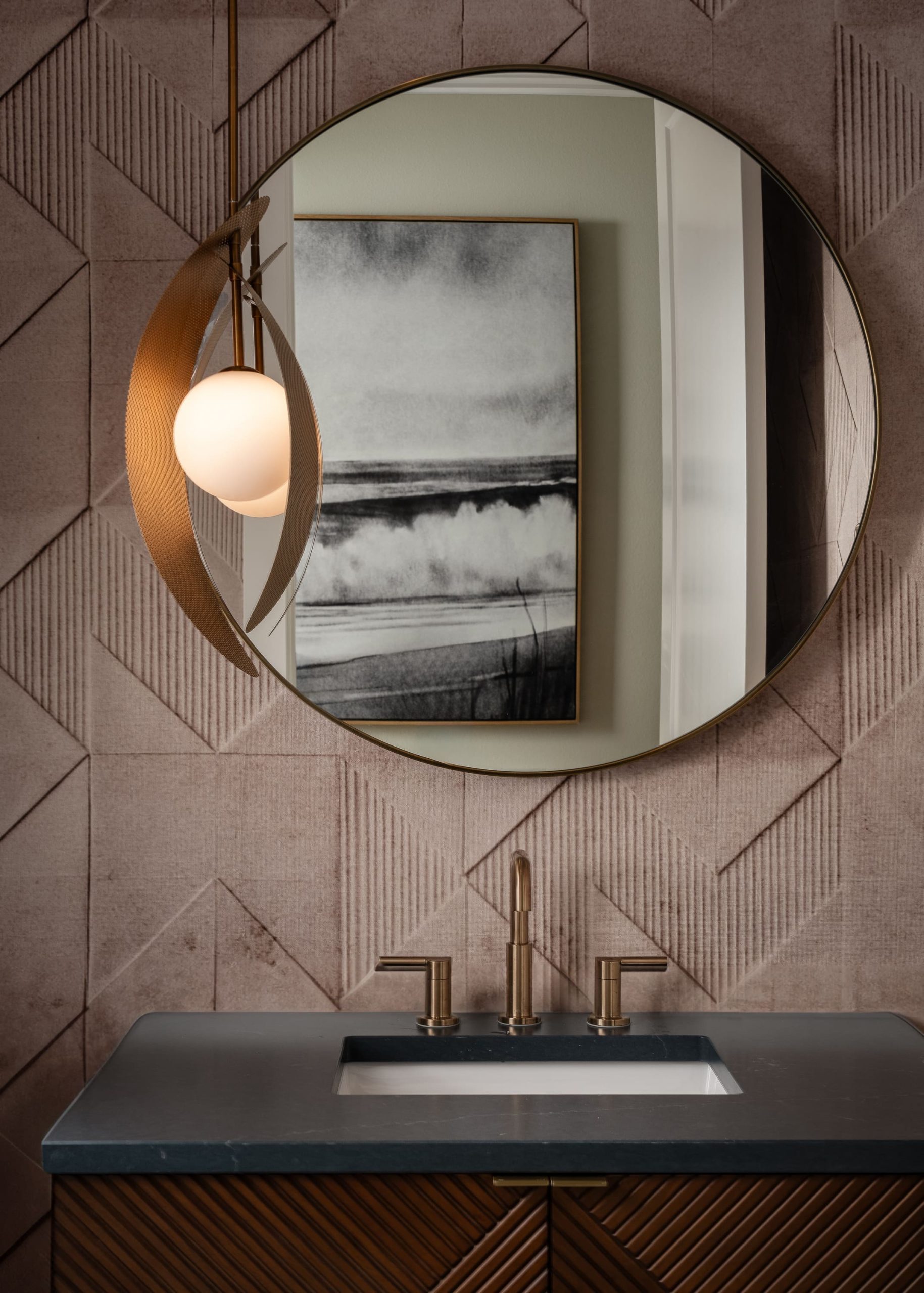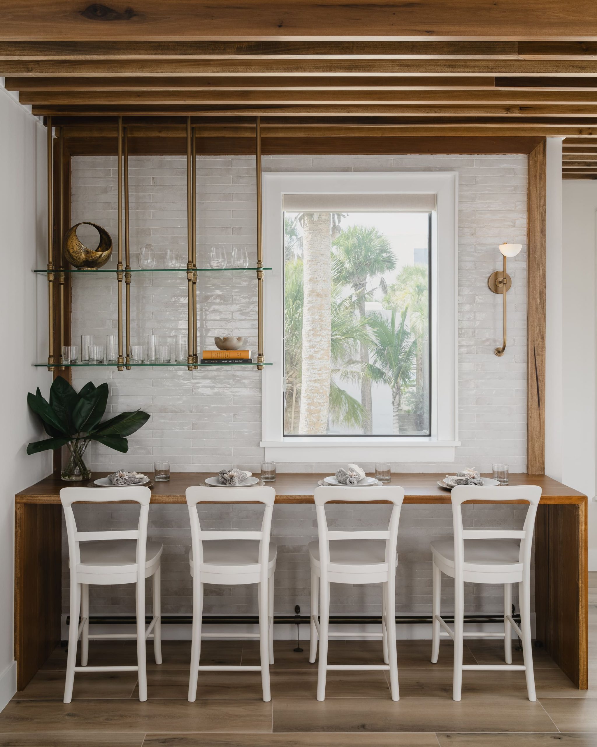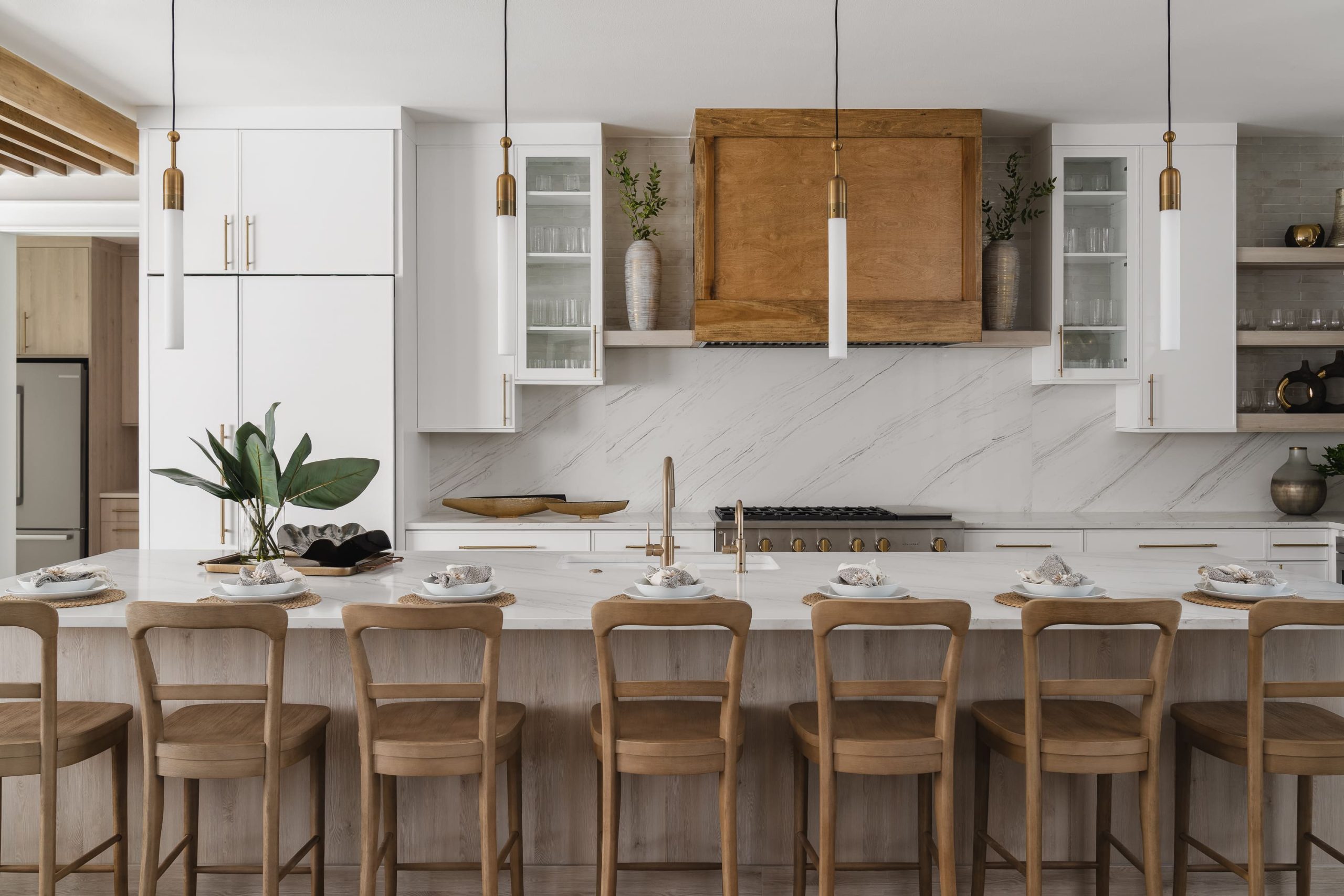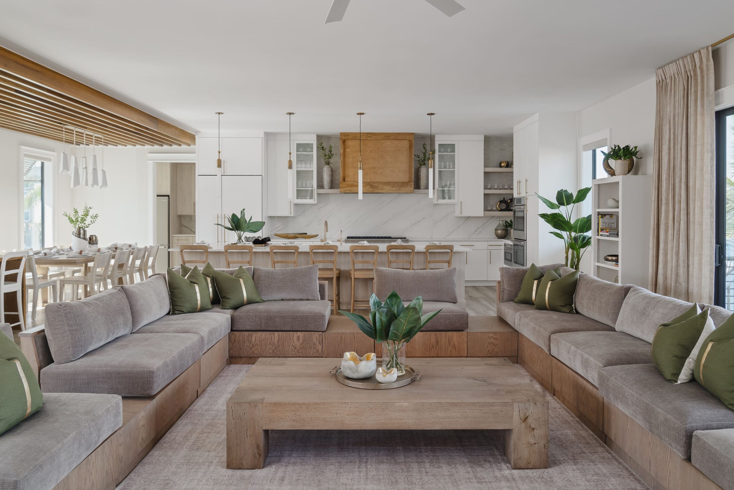 Inspired by the glow of the setting sun, The Overlook is shaped by warmth, artistry, and refined simplicity. Bright whites form a crisp foundation, layered with a warm, organic palette enriched by golden hues that echo the surrounding landscape. Brass hardware and detailing add subtle luminosity, while artisan tile and patterned mural wallcoverings introduce moments of texture and visual storytelling. Streamlined forms keep the interiors feeling clean and composed, allowing light and material to take center stage. Designed to blur the boundary between indoors and out, the home unfolds as a welcoming coastal retreat—one that fully embraces the warmth and ease of sunset living.